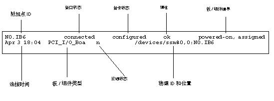 如需获得详细的状态报告,可使用 cfgadm -av 命令。使用 -a 选项可以列出附加点,-v 选项可以列出详尽的描述。