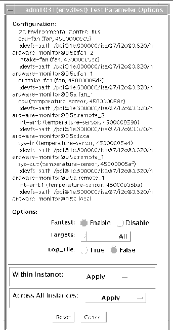 /opt/SUNWvts/bin/env3test [standard arguments] -o dev=driver_name, logging=true|false, fantest=enable, fan=All/intake-fan+outtake-fan