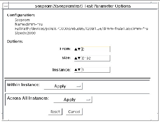 To reach the following dialog box, right-click on the test name in the System Map and select Test Parameter Options. If you do not see this test in the System Map, you might need to expand the collapsed groups, or your system might not include the device appropriate to this test. Refer to the SunVTS User's Guide for more details.