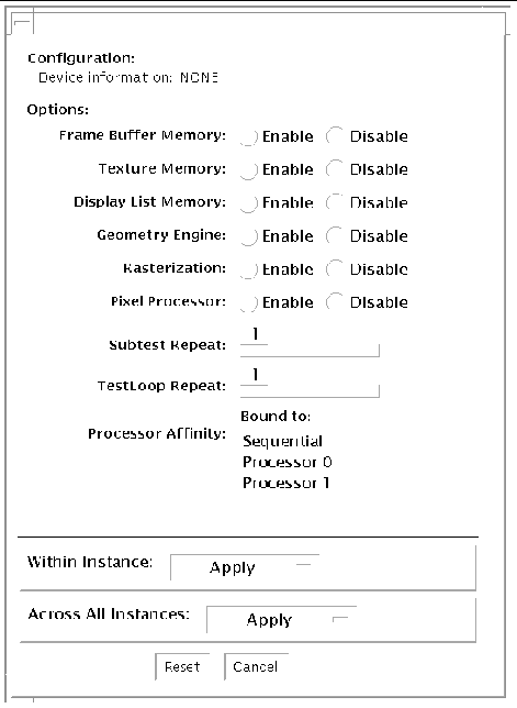To reach the dialog box below, right-click on the test name in the System Map and select Test Parameter Options. Because graphics test can test multiple types of frame buffers, the test name that is displayed will correspond to the particular framebuffer being tested. If you do not see this test in the System Map, you might need to expand the collapsed groups, or your system may not include the device appropriate to this test. Refer to the SunVTS User's Guide.