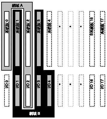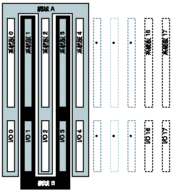 網域 A 包括系統板 0 和 2,以及 I/O 板 2。網域 B 包括系統板 1 和 3,以及 I/O 板 1、3 和 4。