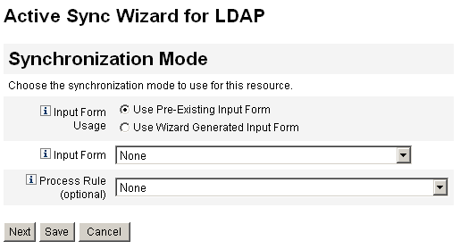输入表单用法 - 选择设置活动同步时使用的模式。可以选择使用之前已存在的表单,但这会限制该资源的配置选项的使用。也可以使用由活动同步向导生成的表单,该表单可以提供一组完整的配置选项。