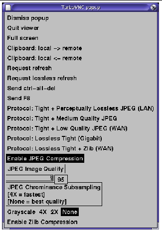 For dynamic control of the protocol, you can press the F8 key after connecting to display a menu (see FIGURE B-3) from which you can dynamically control the image encoding protocol and parameters.