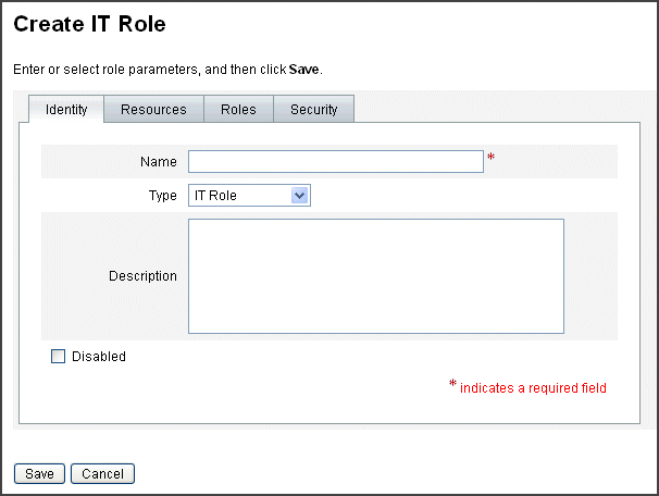 图 4-3 显示了“创建角色”表单的标识选项卡。有关使用此表单的帮助,请参见联机帮助。