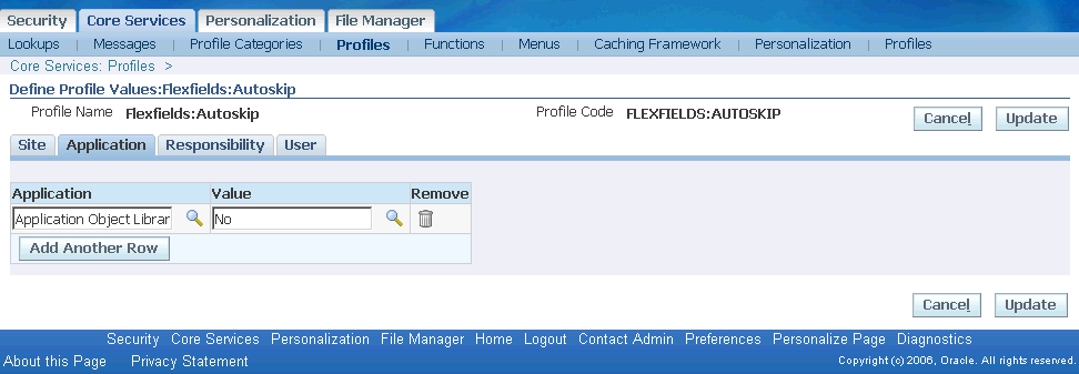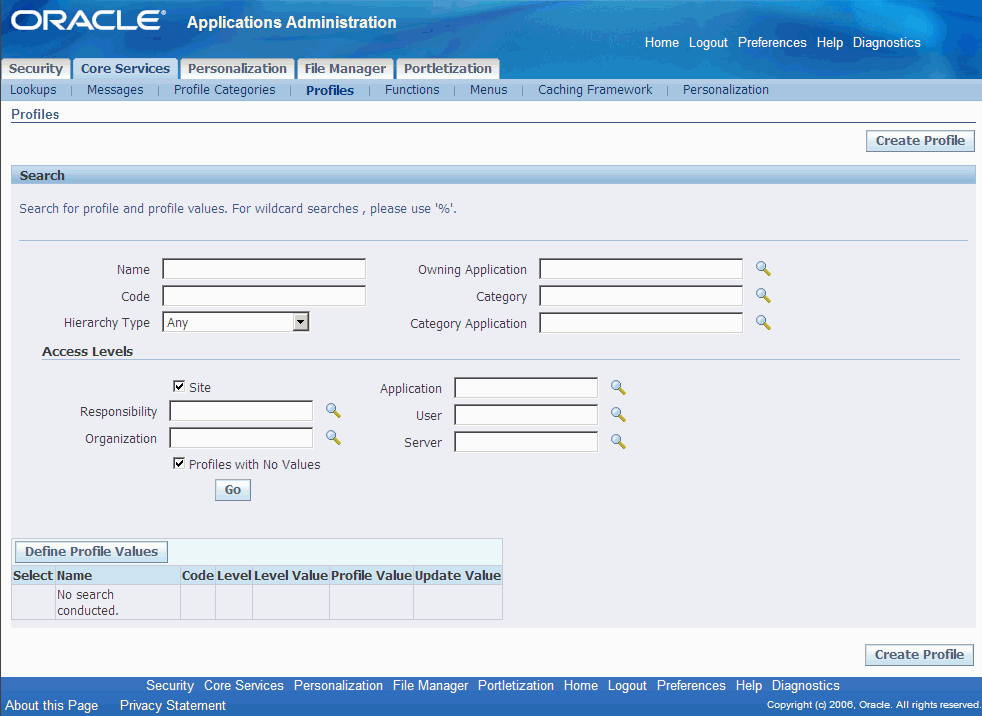 HTMLベースのプロファイル・ページを使用してプロファイル値を管理することもできます。これらのページは、「コア・サービス」の下で機能管理者職責から使用できます。