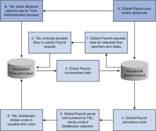 The following flowchart illustrates the interactions between PeopleSoft Global Payroll and PeopleSoft Time and Labor.