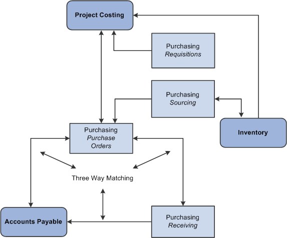 You can enter requisitions into PeopleSoft Purchasing, and then pull them into PeopleSoft Project Costing for tracking purposes. This diagram shows the procurement process flow associated with requisitions when PeopleSoft Project Costing is integrated with PeopleSoft Purchasing, PeopleSoft Payables, and PeopleSoft Inventory: