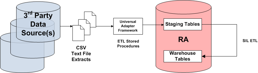 The goal of the Universal Adapter Framework (UAF) is to simplify the process of moving source dependent extracts into Retail Analytics staging tables for customers with non-RMS data sources. In terms of implementation, the UAF first requires comma separated value (CSV) text file extracts to be provided as inputs. Once the CSV files are in place, the UAF can be used to move that data into Retail Analytics staging tables through the use of Oracle external tables (see Figure 7-2, "Moving Third Party Extracts into Retail Analytics Staging Tables"). The DDL and DML necessary to create and populate the external tables with the data from the text file extracts will be housed within stored procedures that can either be invoked manually (for example, using a shell script) or via an ODI agent.