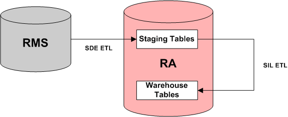 The Retail Analytics BI product offering is intended to work closely with Oracle Retail's transactional schema, RMS. As such, Retail Analytics ships with source dependent extraction (SDE) routines designed to move data from RMS tables into Retail Analytics staging tables, and source independent load (SIL) routines to move data from staging tables into warehouse tables (see Figure 7-1, "RMS to Retail Analytics Staging Data Flow").