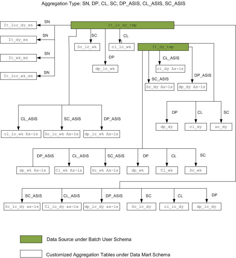 Note: _ASIS & _REC_ASIS aggregation_types are not supported by attribute aggregation process.For reclassification type of aggregation, due to performance concern, the subclass/location/day level is mandatory before clients can aggregate to other levels. All other levels will use the result from the process to continue higher level aggregation. |