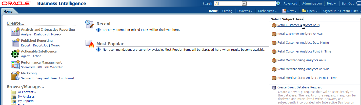 Note: The specific URL and login requirements for Oracle BI depend on how Oracle BI is configured in your enterprise. Your system administrator can supply the information you need to access Oracle BI and Retail Insights. |