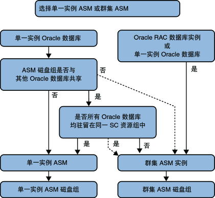 如果决定将 Oracle ASM 用于 Oracle,您应该选择适当的 Oracle ASM 实例。您可以使用下面的图表确定需要单一实例 Oracle ASM 还是群集实例 Oracle ASM。
