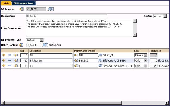 A database process (DB process) allows you to specify a group of maintenance objects that are processed together for a purpose. In addition, you specify the parent-child constraints that link child maintenance object tables with their parent maintenance object tables within the DB process.