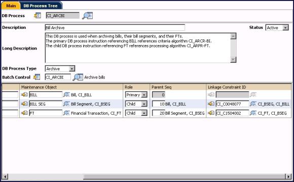 Let's say our DB process purpose is archiving bills that were more than four years old. Not only do you need to archive records in tables defined under the BILL maintenance object, you also need to archive the related records in tables defined under the BILL SEG maintenance object and the FT maintenance object. Note the linkage constraints specified for BILL SEG and FT.