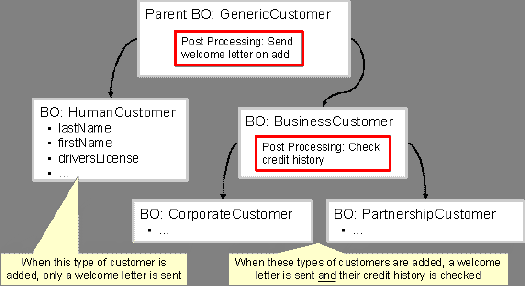 A business object may inherit business rules from another business object by referencing the latter as its parent. A child business object can also have children, and so on. A parent's rules automatically apply to all of its children (no compilation - it's immediate). A child business object can always introduce rules of its own but never remove or bypass an inherited rule.