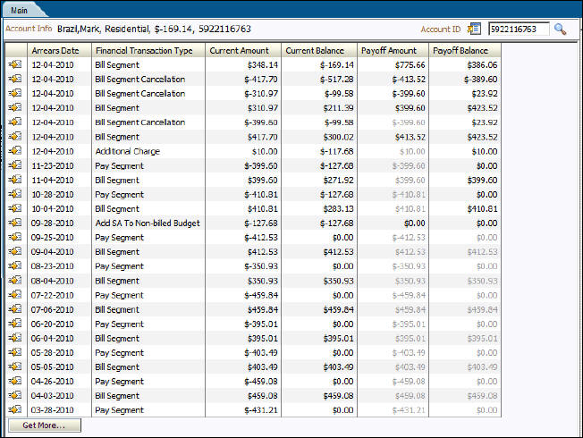 Grids that can potentially contain a large number of rows have special processing that we refer to as "get more" functionality. We'll use an example from Oracle Utilities Customer Care and Billing to explain - consider the grid that contains all payments that have been added to a cash drawer. By the end of the day, this grid could contain hundreds of rows (one for each payment remitted during the day). Rather than show every payment in the grid, the system retrieves the first X payments (where X varies from grid to grid, and from release to release) and appends a button to the bottom of the grid as illustrated below: