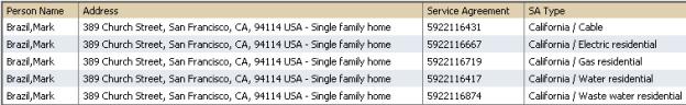 A grid is used to display one or more rows of information. Grids are used in search results, query pages, and some maintenance pages. For example, the following grid shows the service agreements linked to an account.