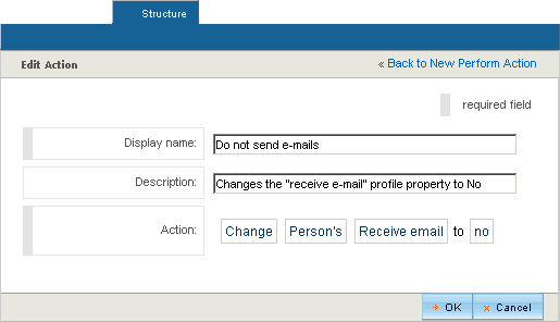 Use the Action fields to specify the parameters that make up the action. In many cases, you can click the element to see the options available for it. In others you type the value directly into the field. For information on how to configure specific actions, see the next section, Configuring Actions.