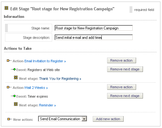 To remove an action or a child stage, display the Structure tab for the root stage by clicking its name in the Stages list. Then use the Remove Action or Remove Next Stage buttons to delete the appropriate element. See the image below.