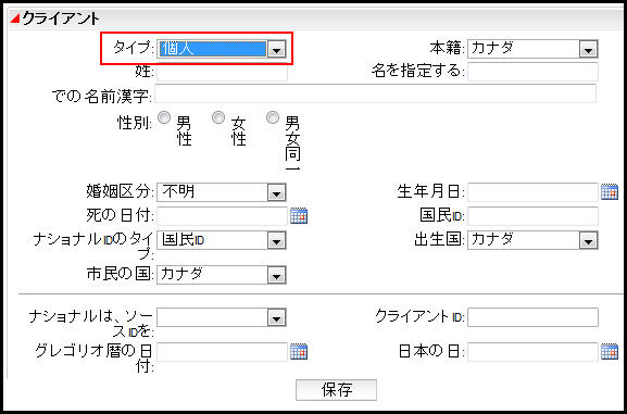 「種別」ドロップダウン・ボックスからクライアントの種別を選択します。「クライアント」画面は、入力されたクライアントの種別に応じて変化します。表示されるのは、その特定のクライアントの種別に関するフィールドのみです。