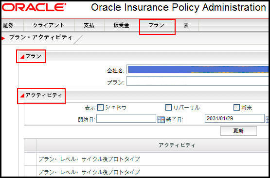 「プラン」画面をオープンした後は、すべてのプラン・アクティビティのリストを会社名およびプラン名で検索することもできます。「プラン」画面の「アクティビティ」セクションに、選択した会社およびプランに関連付けられているプラン・レベルのアクティビティが表示されます。