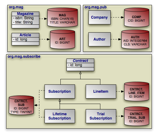 4. Contract is abstract and is not a mapped class (it uses subclass-table inheritance), and therefore it has no discriminator. Its two subclasses Subscription and LineItem, however, are each the least-derived mapped classes in the hierarchy, and so they each declare a discriminator. Note that though they are sibling classes, they can each use a different discriminator mapping because their superclass is unmapped.