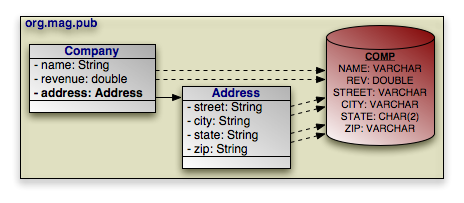 Chapter 5, Metadata describes JDO's concept of embedded objects. The field values of embedded objects are stored as part of the owning record, rather than as a separate database record. Thus, instead of mapping a relation to an embedded object as a foreign key, you map all the fields of the embedded instance to columns in the owning field's table.