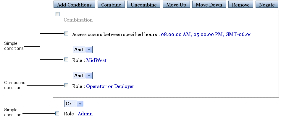 Operator or Deployer role.Admin role.The policy in Figure 1 uses both simple conditions, which contain a single predicate, and a compound condition which contains multiple predicates. You specify whether a condition is simple or complex at the time that you create the condition (for example, see Create policies for resource instances). Use compound conditions if you want to consider the two predicates as a single unit.