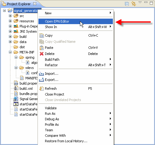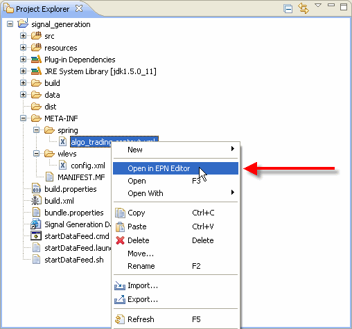 EPNエディタは、Oracle CEPアプリケーションのプロジェクト・フォルダ、コンテキストまたは構成ファイルから開くことができます。