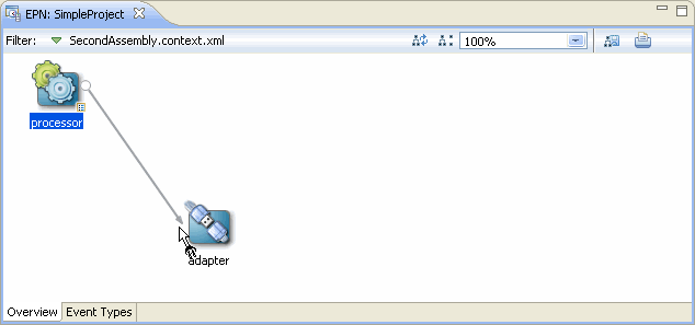 EPNエディタでは、新規アダプタ・ウィザードで指定したファイルにアダプタ構成を作成し、エディタのフィルタで示されているソース・ファイルを編集して、図6-37に示すように新規EPNノードを表示します。
