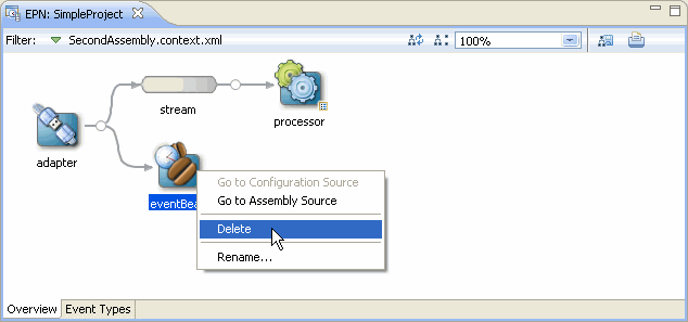 注意: bean または他の匿名要素を削除すると、そのオブジェクトを含むオブジェクトも削除されます。たとえば、bean がwlevs:listener 要素内にある場合、bean を削除すると、listener 要素も削除されます。 |