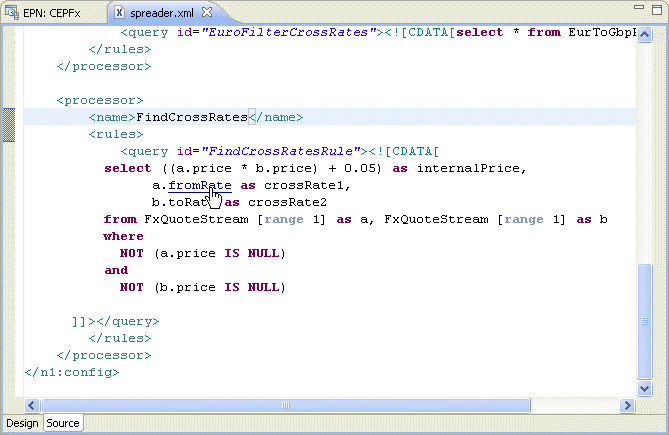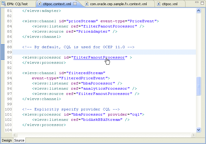 コンポーネント構成ファイル、EPNアセンブリ・ファイル、またはOracle CQL文を編集するときに、「Ctrl」キーを押してハイパーリンクを有効にします。ハイパーリンクを使用すると、アセンブリ・ファイルと構成ファイルの間を移動し、参照IDに従ってBeanの実装クラスに簡単に移動できます。