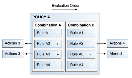 A rule evaluates to true when all the conditions match. The outcome of a rule is a score and optionally actions or alerts, or answers and alerts. The outcome of a policy is decided by applying a scoring policy on the rule scores of the policy. In addition to the score, you can optionally configure trigger combinations which are combinations of rule results of the policy and that can invoke actions and/or generate alerts. For more information about trigger combinations, see Section 10.1.10, "Trigger Combinations and Triggers."