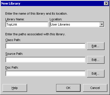 新規ライブラリの名前(たとえば「TopLink」)を入力します。「場所」のデフォルト選択肢が「ユーザー・ライブラリ」のままであることを確認します。