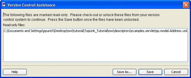 チーム環境で作業している場合は、ファイルをリポジトリから取得する際、ソース制御システムによってファイルがロックされていることがあります。ロックされたファイルをTopLink Workbenchで保存しようとすると、「バージョン制御アシスタンス」ダイアログ・ボックスが表示され、ロックされたファイルが表示されます。