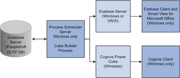 Oracle PeopleSoft Process Scheduler includes a process type definition specifically for use with PeopleSoft Cube Manager. This process type is the Cube Manager process type, and you invoke it whenever you launch the process to create a cube from the standard run control page. During this process, depending on the OLAP tool that you specify, the data and metadata are translated into a format that is understood by Oracle Essbase, Cognos PowerPlay, or another ROLAP tool that can read a star schema.