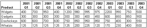 Suppose you want to analyze unit sales of your company. You can examine the total units that were sold in a particular year, but that number might not help you understand much about your business. Instead, you might want to see unit sales broken down by time and by product. The matrix that you use to analyze this data might look like the following table, which represents a cube with two dimensions (time and product):