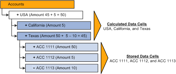 Calculated data cells store values of dimensional intersections of non-level zero members (branch nodes), which are calculated based on the consolidation properties of their children.