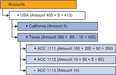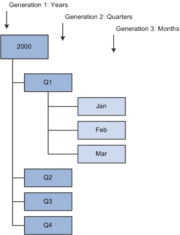 Each box in the diagram represents a unique member. This diagram is familiar to PeopleSoft Tree Manager users. In fact, PeopleSoft trees can play an important role in defining the hierarchy of an OLAP cube.