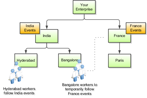The following diagram shows a sample geographical hierarchy where employees of a particular location share calendar events of another country.