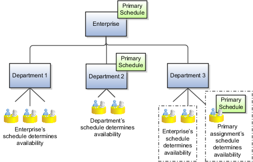 For example, you assigned a primary schedule at the enterprise level. However, since workers belonging to a particular department in that enterprise follow different work timings, you assigned a different primary schedule to that department. The department's primary schedule determines worker availability because that schedule takes precedence over the one that was defined at the enterprise level. In the same example, if you assigned a primary schedule to a worker (primary assignment) belonging to the same department, then that schedule determines the worker's availability because a schedule assigned to the primary assignment takes precedence over the ones defined at the department level and the enterprise level. The following diagram illustrates this example: