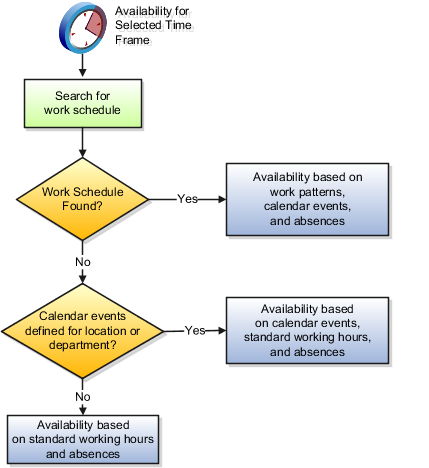 If no primary schedule was assigned to any of the workforce structures, then the worker availability is based on absences, calendar events, if created for the worker's location or department, and standard working hours defined for the worker's primary assignment. If no calendar events were created, then the application determines availability only on the basis of the standard working hours and absences.