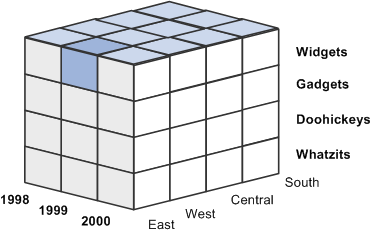 The preceding three-dimensional OLAP cube represents units sold dimensioned by time, product, and location. (The location members are East, West, Central, and South.) The shaded cell represents the number of widgets sold in the East region in 1999. You could find the number of units sold for any other product in any other region at any other time by finding the cell at the intersection point of three members, one from each dimension.