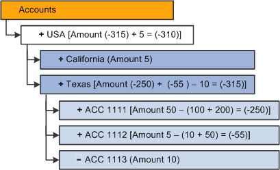 However, you also might find dimensions in which certain members are to be subtracted from their siblings, such as in a profit dimension. In such a dimension, suppose two members are at the first level, margin and total expenses, both of which are reported as positive values. To find the total profits, you would not add margin and total expenses, instead you would subtract total expenses from margin.