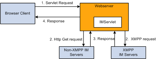 For non-XMPP servers, IM Servlet will send http get request to corresponding Instant Messaging server to find out presence information. For XMPP servers, IM Servlet will contact XMPP server via smack API to get presence information.