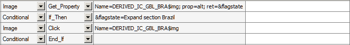 For example, suppose that you use the Message tool to determine that when the region is already collapsed, the alt property of the flag image is equal to “Expand section Brazil.” Alternatively, when the region is already expanded, the alt property of the same image is equal to “Collapse section Brazil.” You would construct your test such that the click would only occur if the alt property is equal to “Expand section Brazil.” You could do that with the following steps: