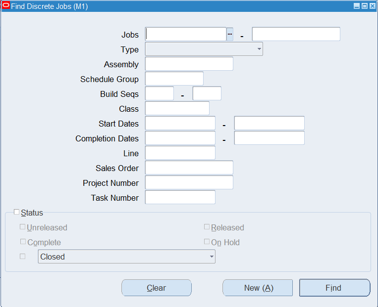 You can find all records with a specific Group ID. You can also find all records that have a specific Process Phase (Validation, Explosion, Creation, or Complete), Process Status (Pending, Running, Error, or Complete), Source Code, Source Line ID, Load Type (Create Standard job, Create Repetitive Schedule, Update Discrete Job, or Create Non-standard Job), or are for a specific Organization. You can also search for a specific Job, Assembly, or Line and Assembly.
