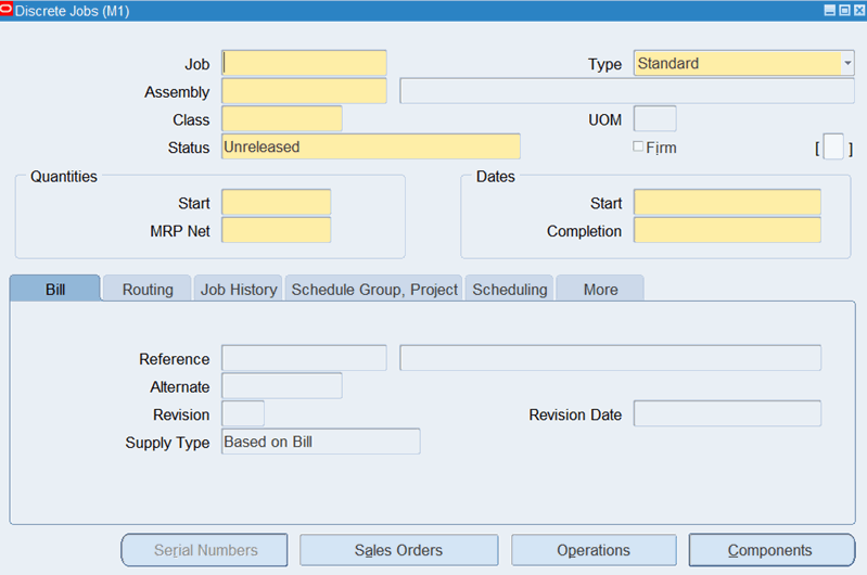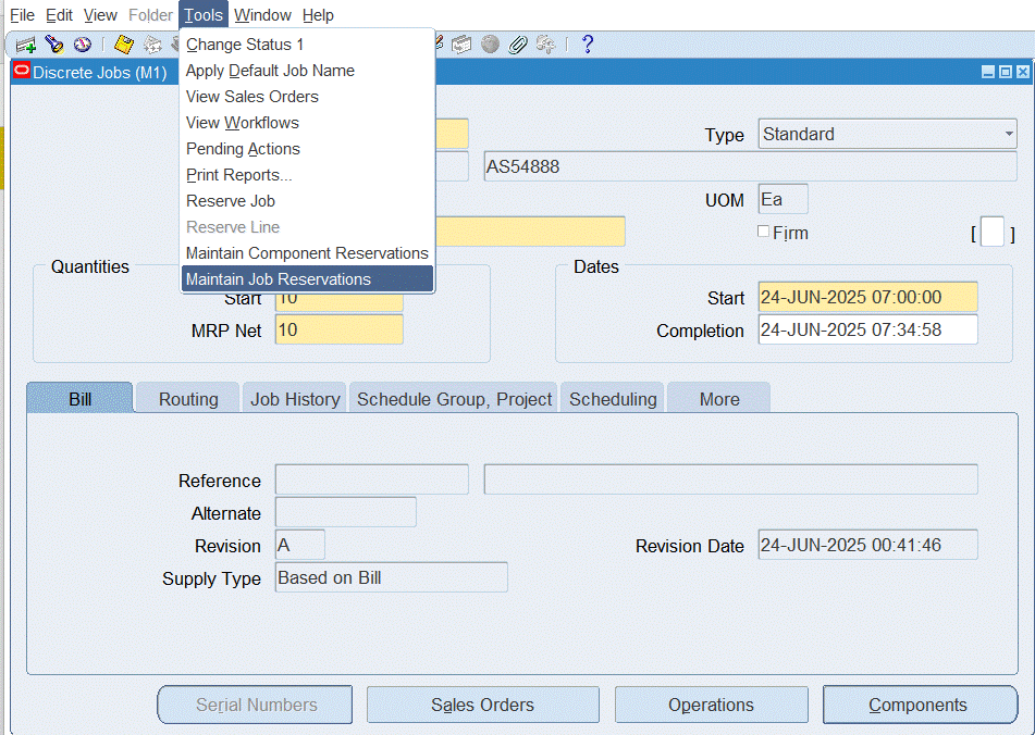 In the Bill tabbed region, select the bill of material Reference for your non-standard discrete job.