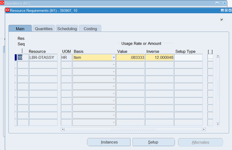 You can assign a resource basis type of Item to a resource if its per unit usage rate is dependent on the number of assembly items being produced. If the per unit usage rate is fixed, for example labor to setup a machine for a job, you can assign a resource basis of Lot. See: Resource Usage, Oracle Bills of Material User's Guide.
