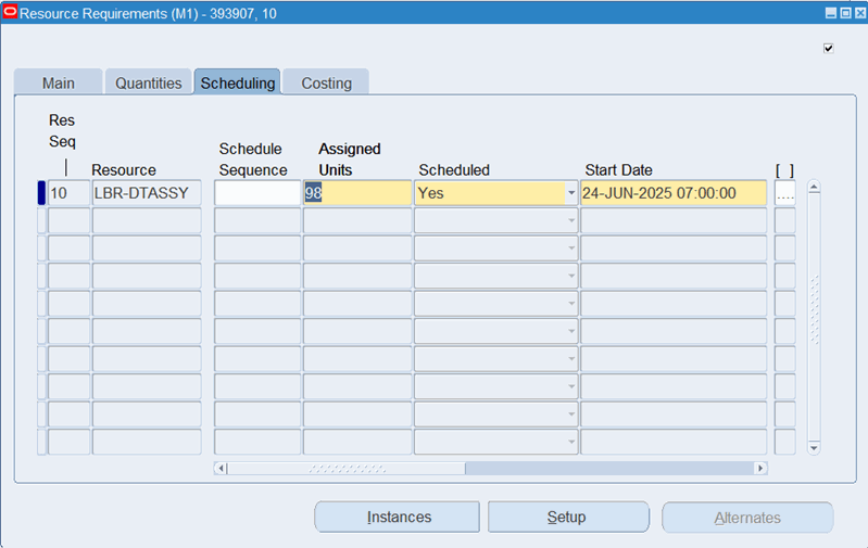 Resource requirements are used for detailed scheduling. When multiple resources are assigned to an operation, operation start and end dates and times are scheduled based upon the sum of the times required for each resource. Job and repetitive schedule start and end dates and times are scheduled based upon sum of the time required for each operation.